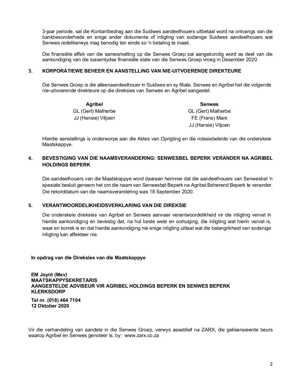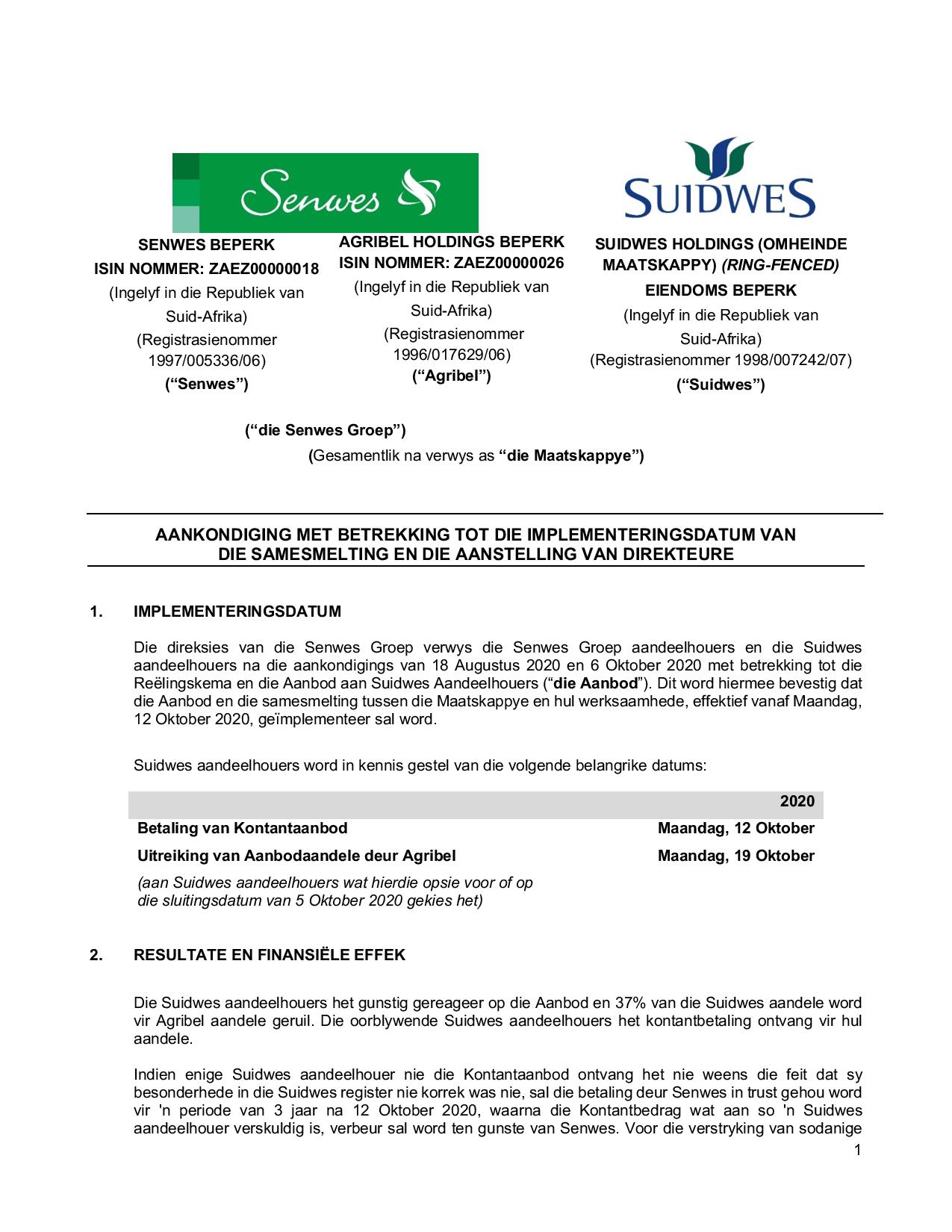 Aankondiging met betrekking tot die implementeringsdatum van die samesmelting en die aanstelling van direkteure