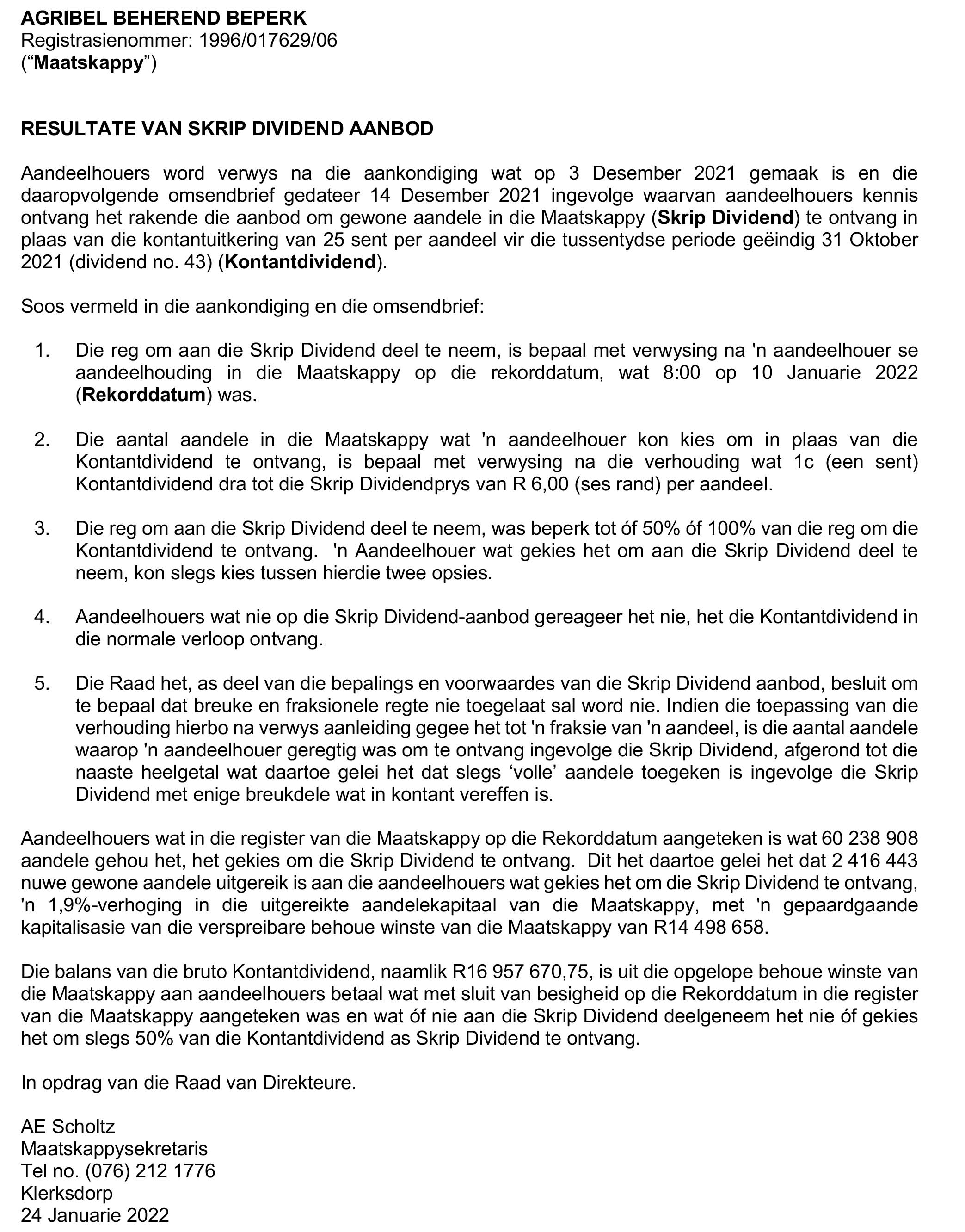Agribel | Resultate van Skrip Dividend Aanbod