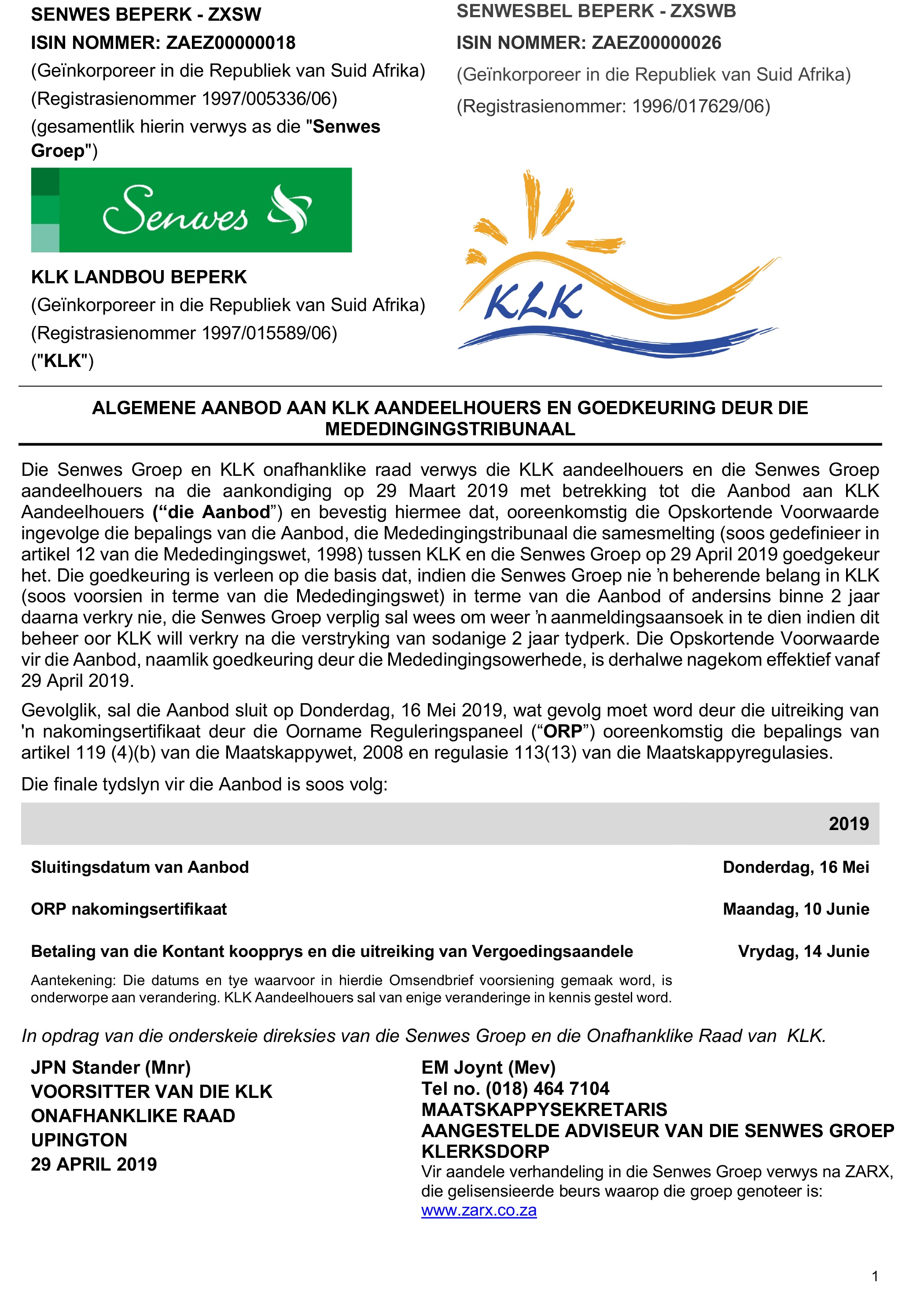 Algemene aanbod aan KLK aandeelhouers en goedkeuring deur die mededingingstribunaal