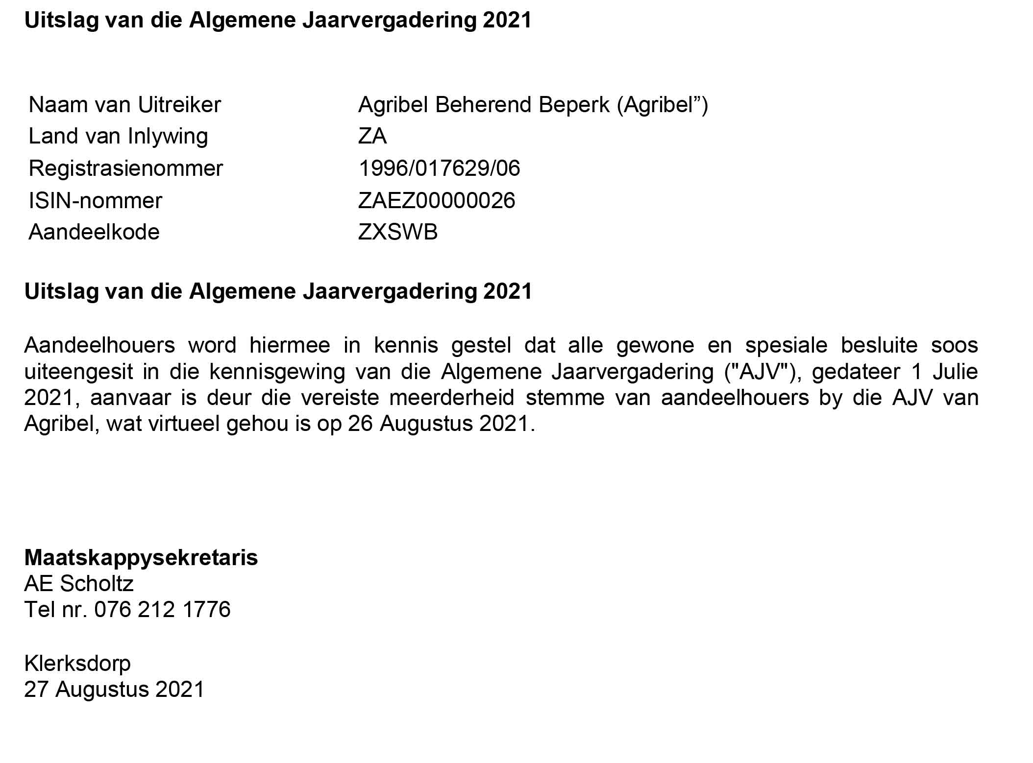 Uitslag van die Algemene Jaarvergadering 2021 - Agribel
