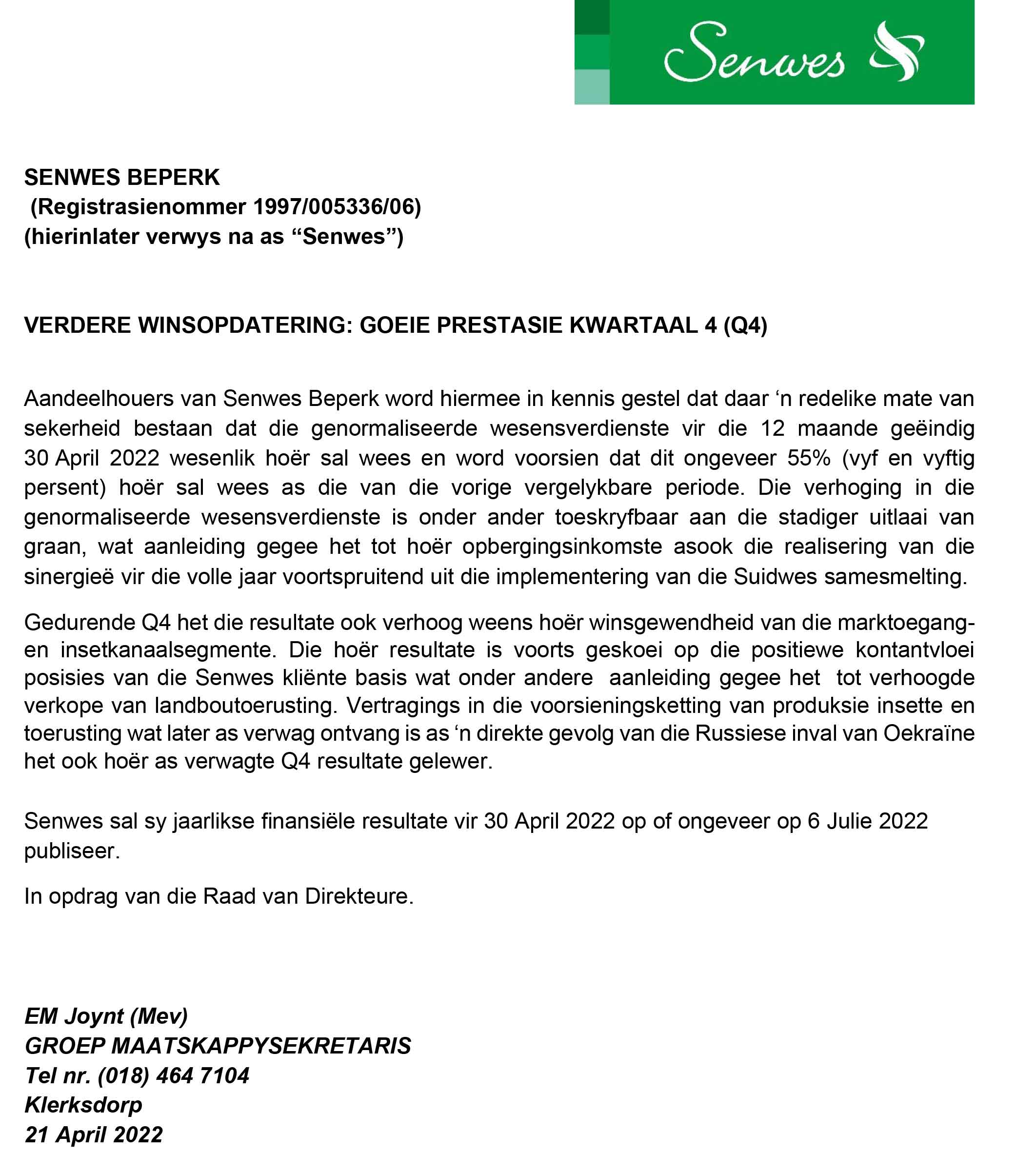 Verdere Winsopdatering: Goeie prestasie kwartaal 4