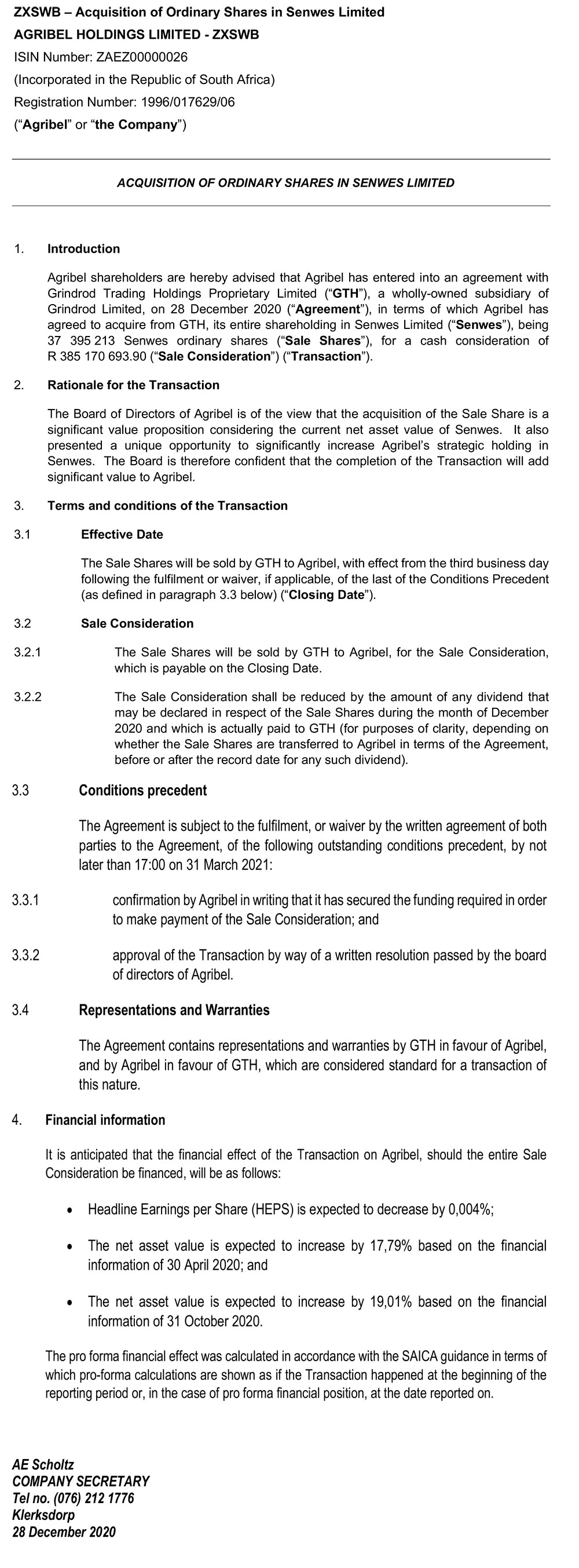 Acquisition of Ordinary Shares in Senwes Limited