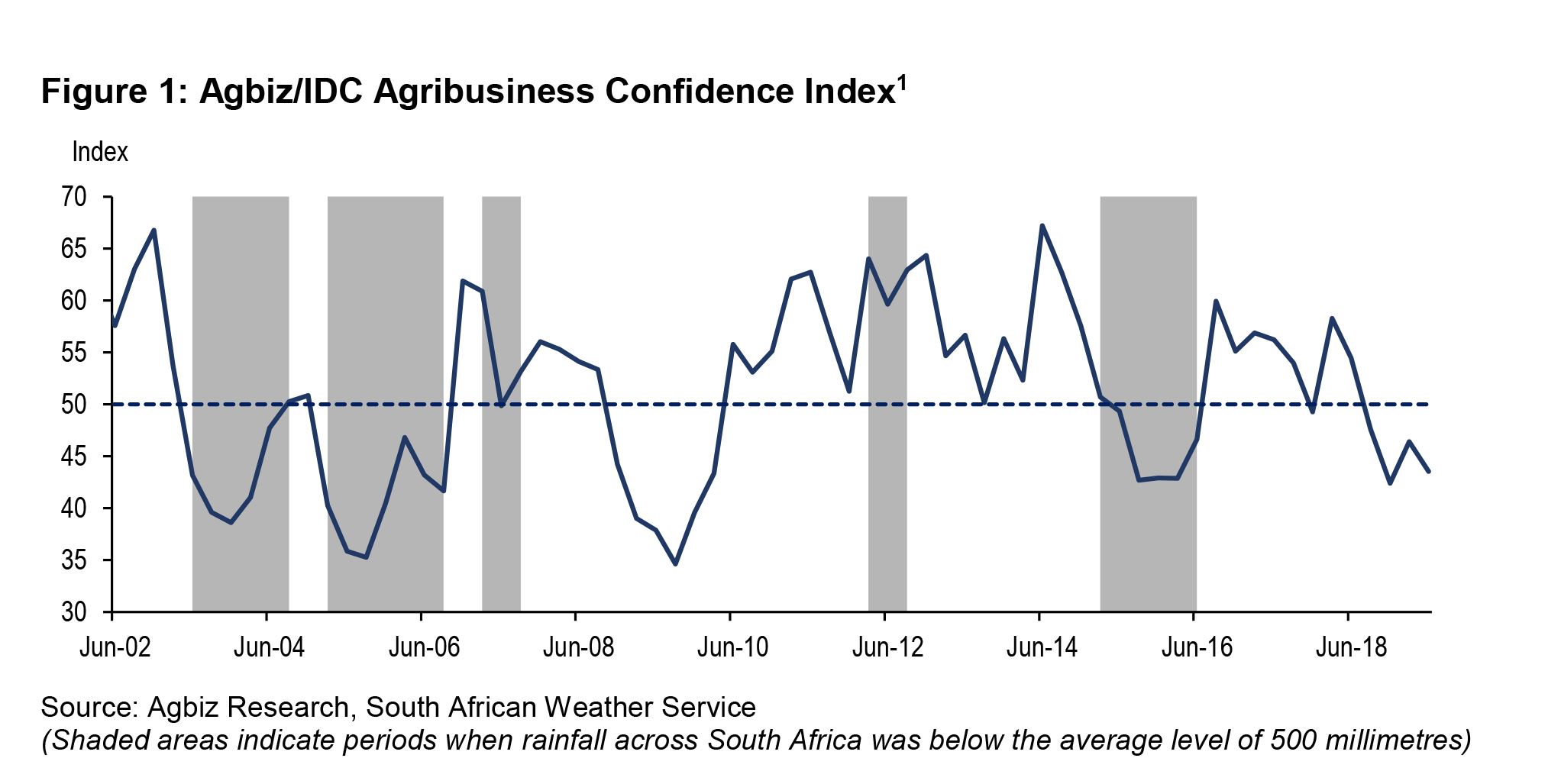 Not surprisingly, the employment confidence fell by 6 points to 48, which is the lowest level since the third quarter of 2015 – which was a drought year. The reduced activity in the fields on the back of unfavourable weather conditions might have contributed to this despondency. Also worth noting is that agricultural employment has generally been under pressure with the latest Quarterly Labour Force Survey data (Q1: 2019) showing that South Africa’s primary agricultural employment fell by 1% from the corresponding period last year to 837 000.
