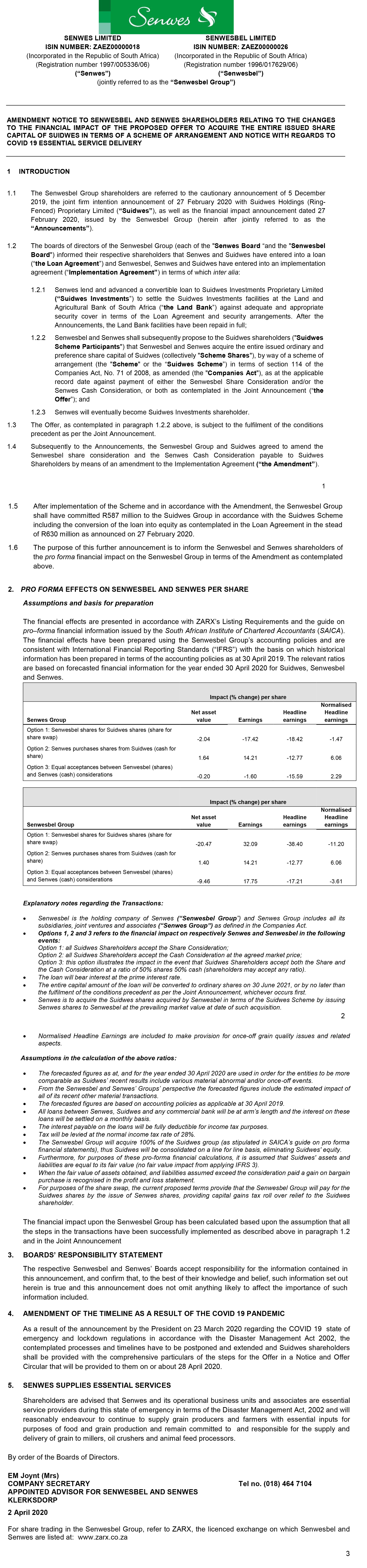 Amendment notice relating to the changes to the financial impact of the proposed offer to acquire the entire issued share capital of Suidwes