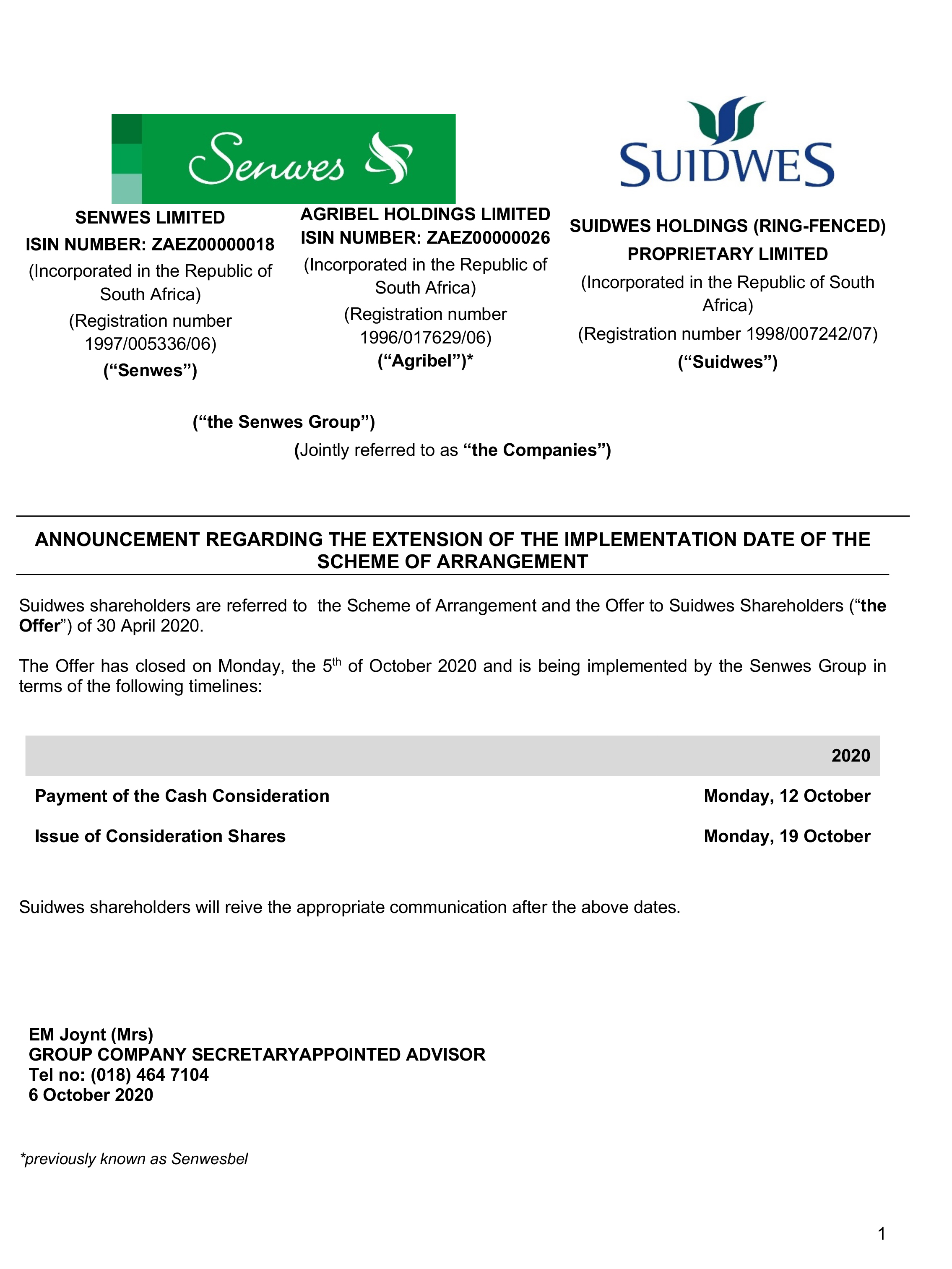 Announcement regarding the extension of the implementation date of the scheme of arrangement