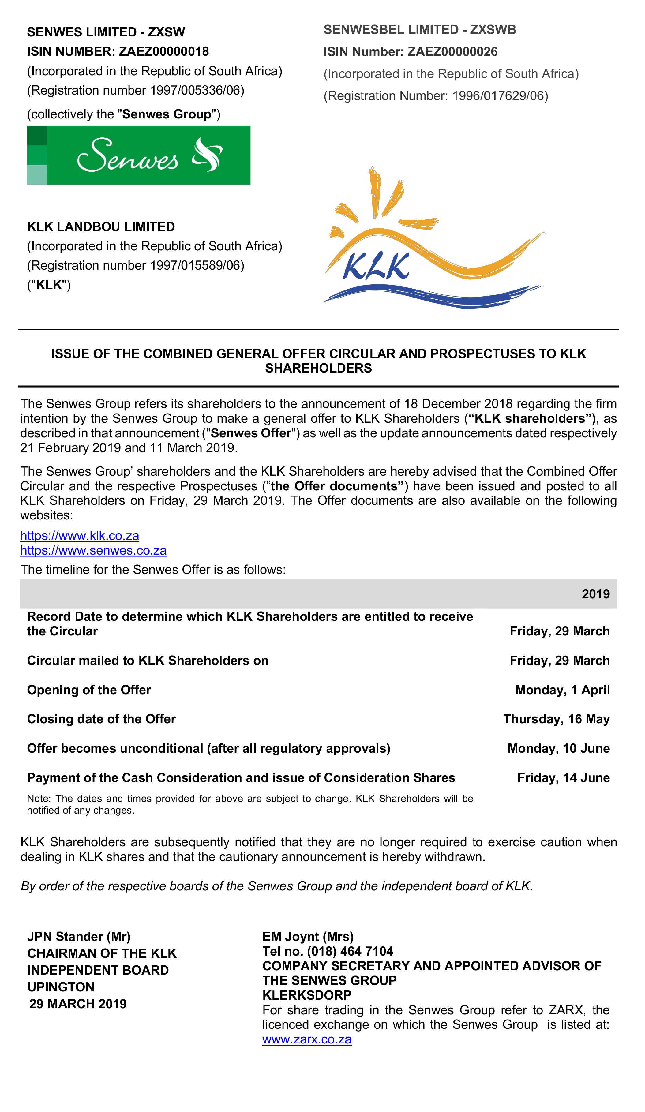 Combined general offer circular and prospectuses to KLK shareholders