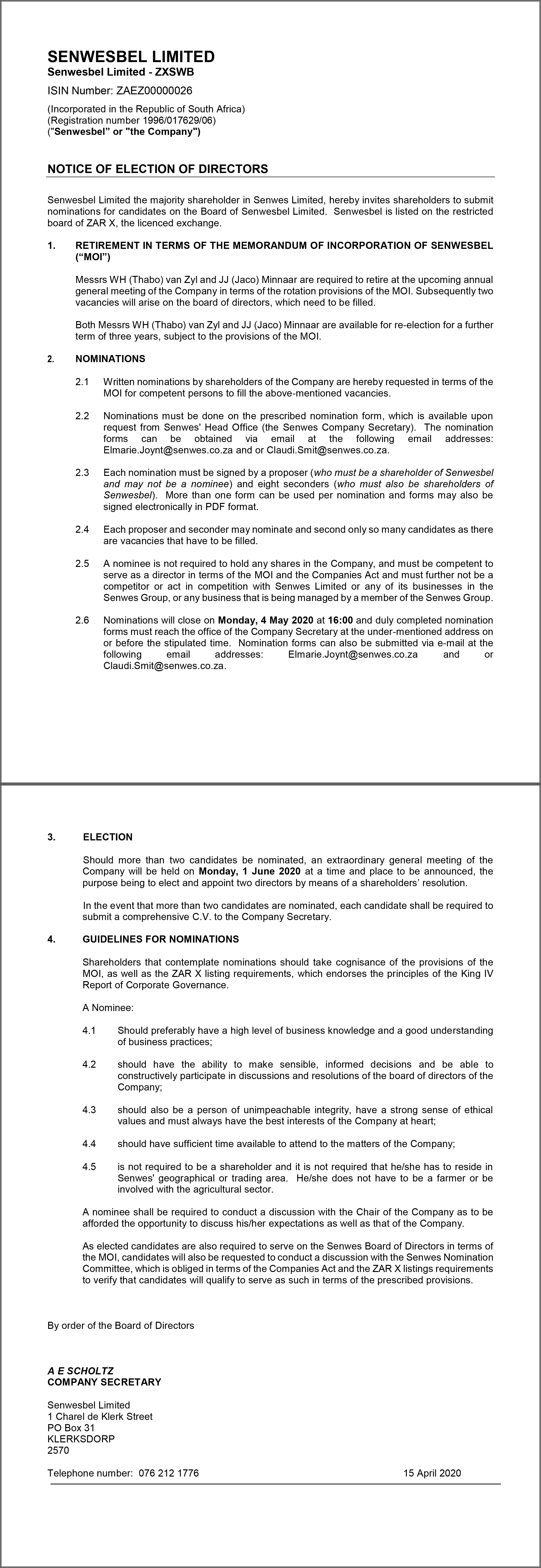 Notice of election of directors
