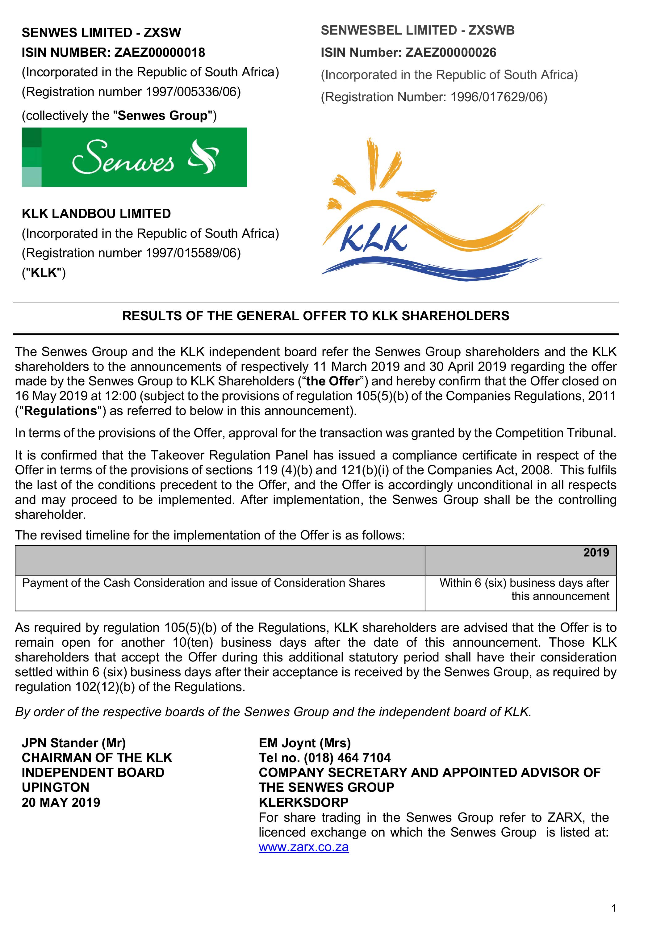 Results of the general offer to KLK shareholders