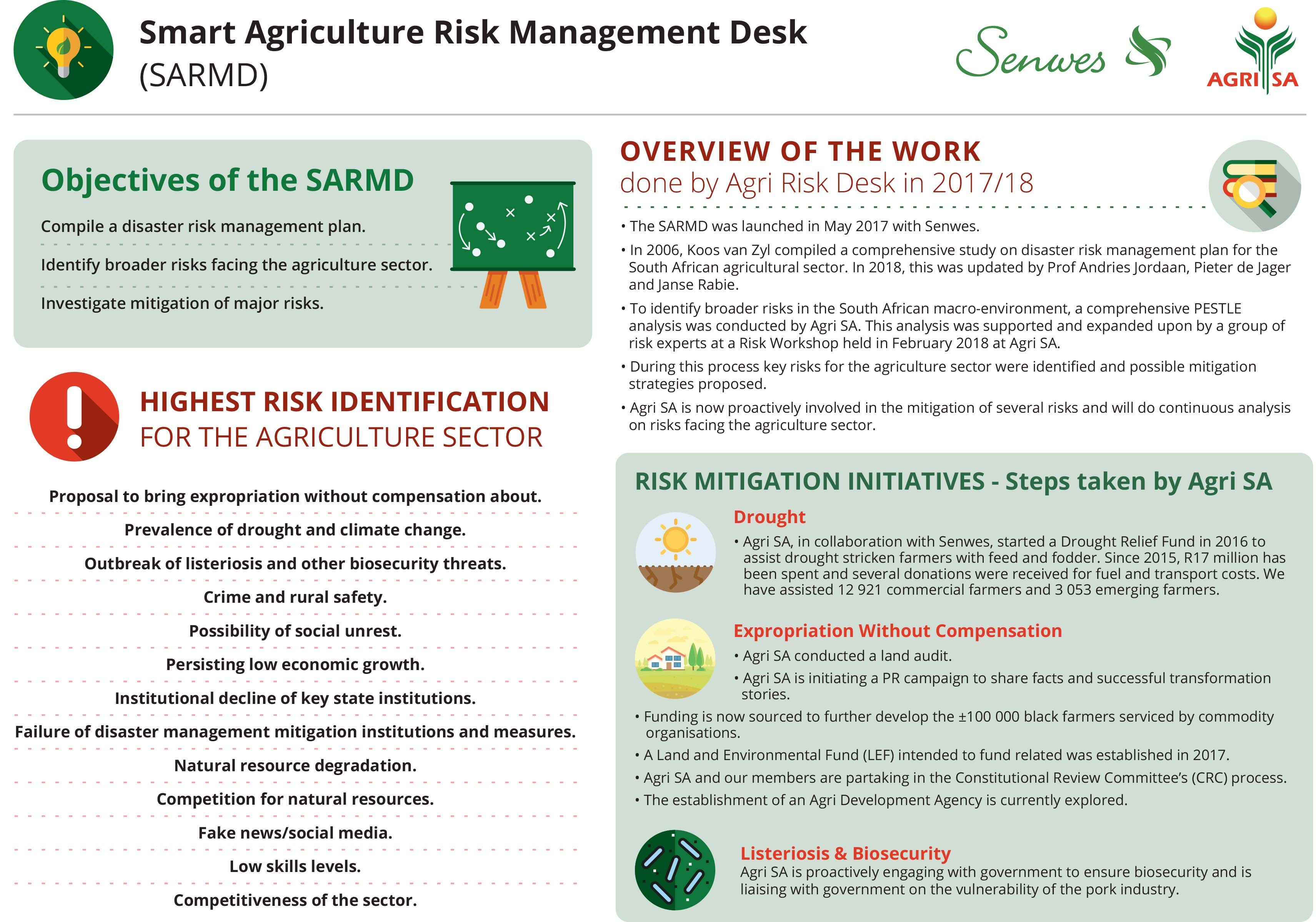The Smart Agriculture Risk Management Desk (SARMD) was launched in collaboration with Senwes in May 2017. The objectives of the SARMD was to compile a disaster risk management plan, identify broader risks facing the agriculture sector and to investigate mitigation strategies of major risks.  “The interaction of challenging economic conditions, persisting political uncertainty and climate change have created the need for a systematic approach to risk management in the agriculture sector” said Omri van Zyl, executive director of Agri SA.