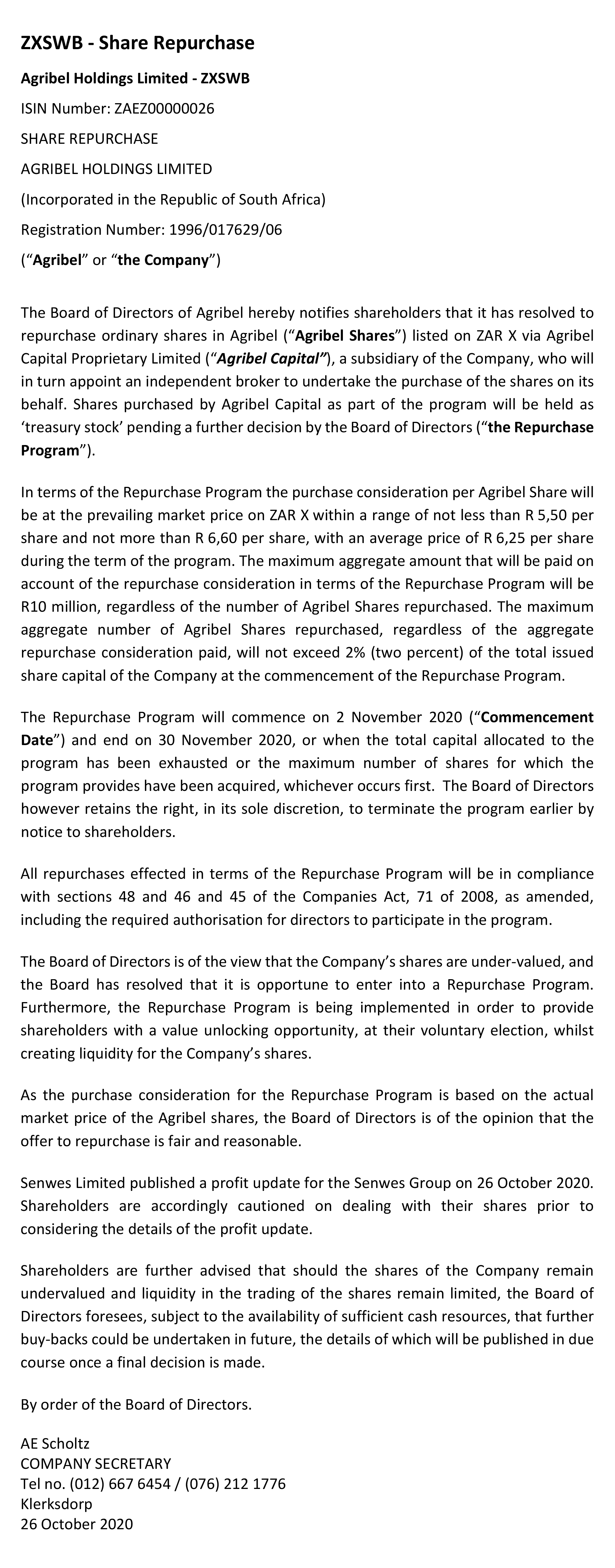 Share Repurchase - Agribel Holdings Limited