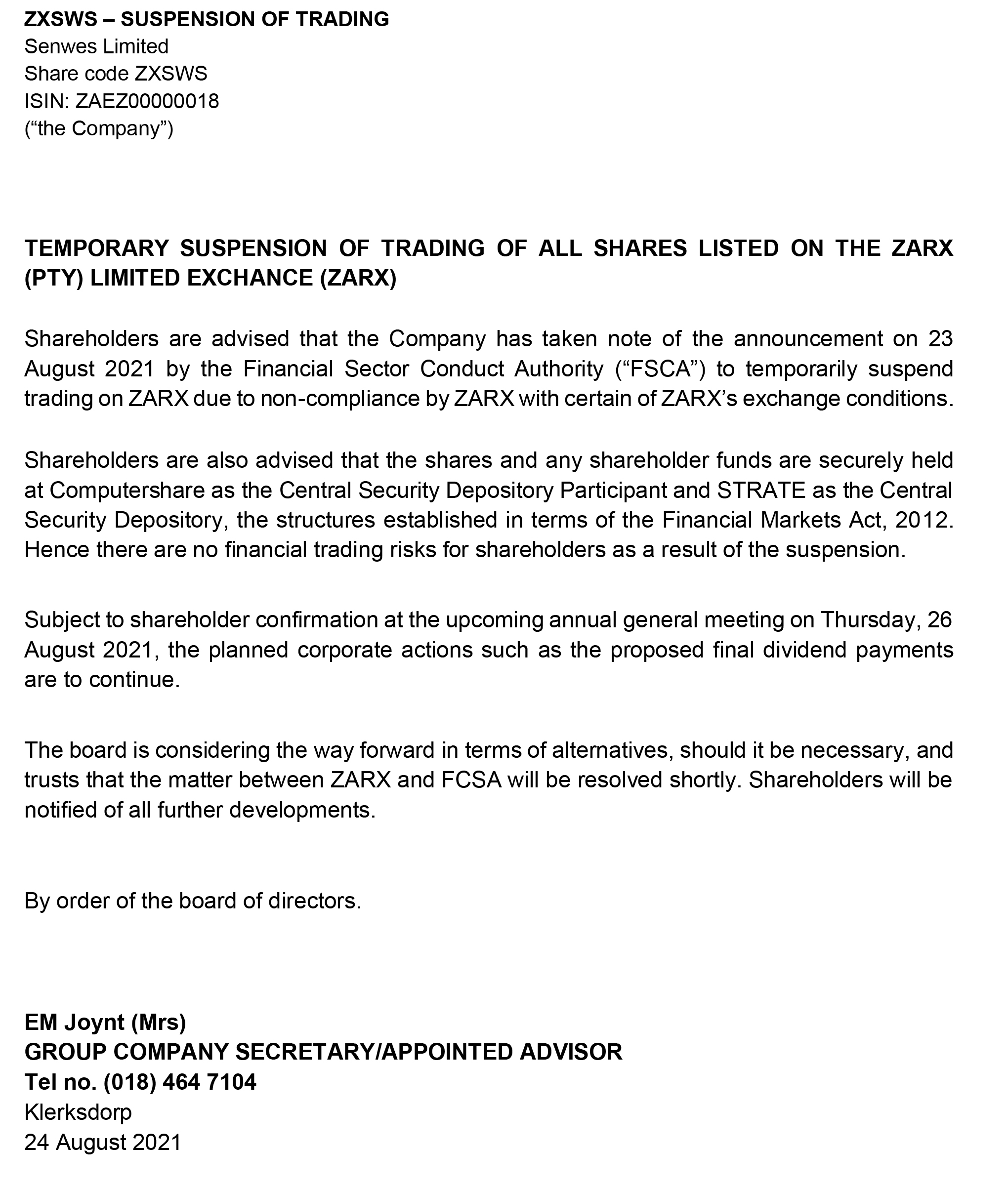 Temporary suspension of trading of all shares listed on the ZARX (PTY) Limited Exchange (ZARX)