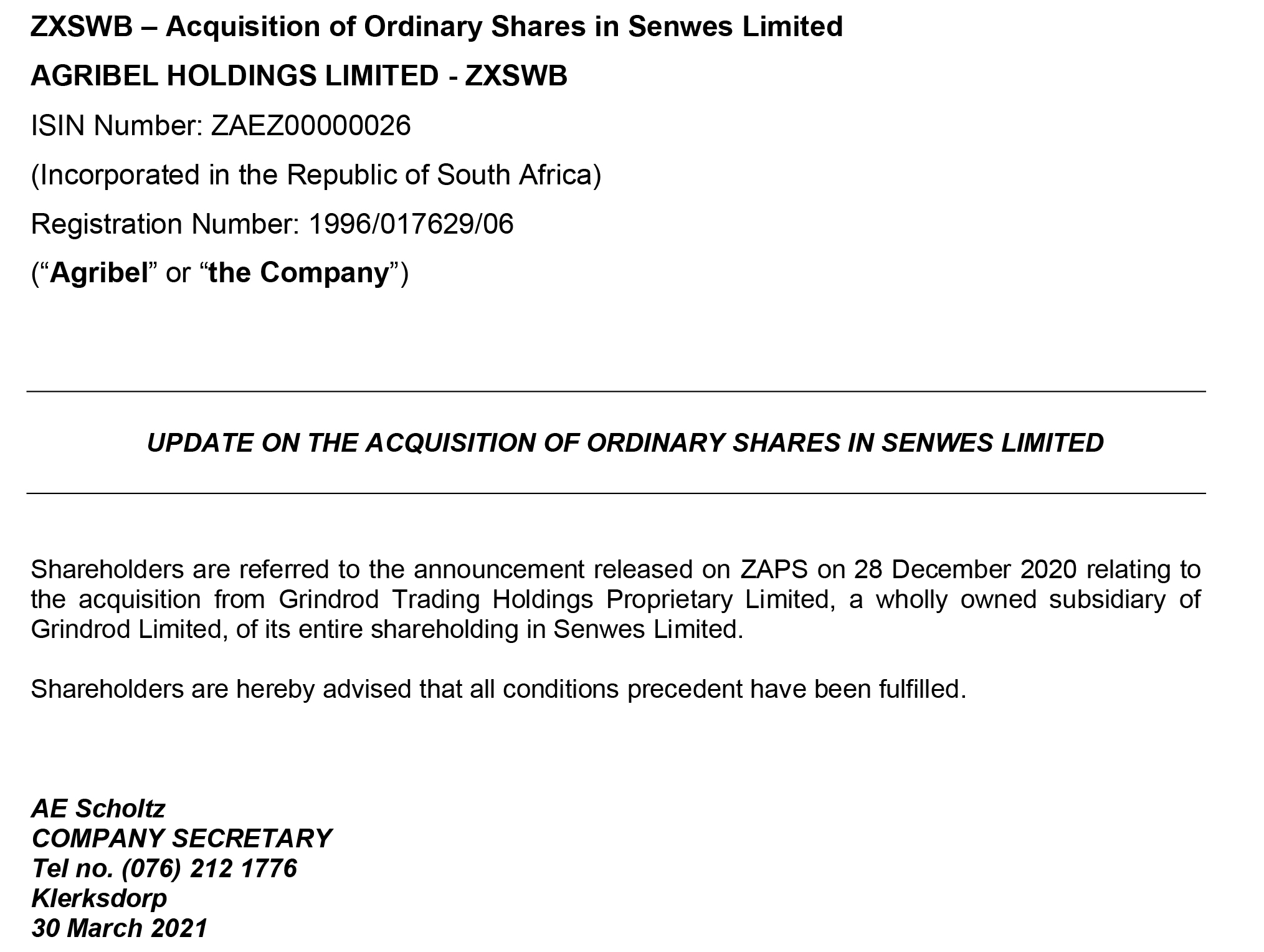 Update on the acquisition of ordinary shares in Senwes Limited